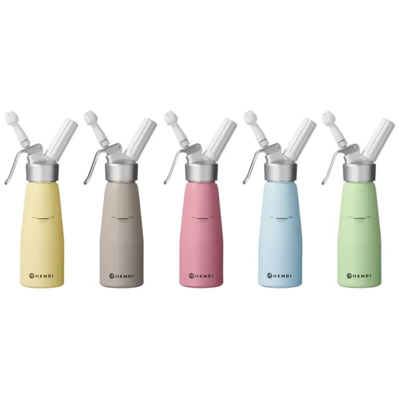 Boca za šlag HENDI pogodna je za pripremu šlaga, moussa i drugih laganih deserata, dok nije pogodna za vruće umake. Za rad s bocom potrebno je koristiti patronu s dušikovim oksidom (N₂O), koja nije uključena u paket. S posudom zapremnine 0,5 litara i dimenzijama 80x(h)260 mm, lako će stati na svaki kuhinjski pult. Ova boca dolazi u nekoliko boja: pastelno žuta, pastelno plava, pastelno zelena, pastelno ružičasta i taupe, čime možete odabrati onu koja najbolje odgovara vašem kuhinjskom prostoru ili stilu.