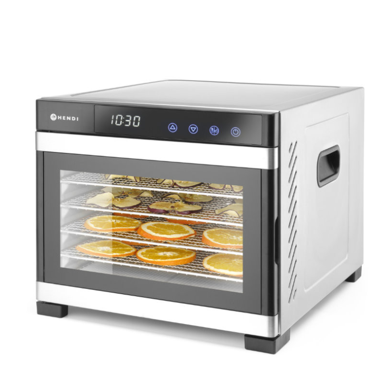 Dehidrator hrane Profi Line dizajniran je za profesionalnu i kućnu upotrebu. Omogućujući učinkovito sušenje voća, povrća, mesa, začinskog bilja i drugih namirnica. Njegovo kućište izrađeno je od visokokvalitetnog nehrđajućeg čelika, pružajući izdržljivost i dugovječnost. Uređaj dolazi s digitalnim upravljačkim pločama i tajmerom koji se može postaviti do 24 sata s intervalima od 30 minuta, čime se osigurava precizna kontrola procesa dehidracije.