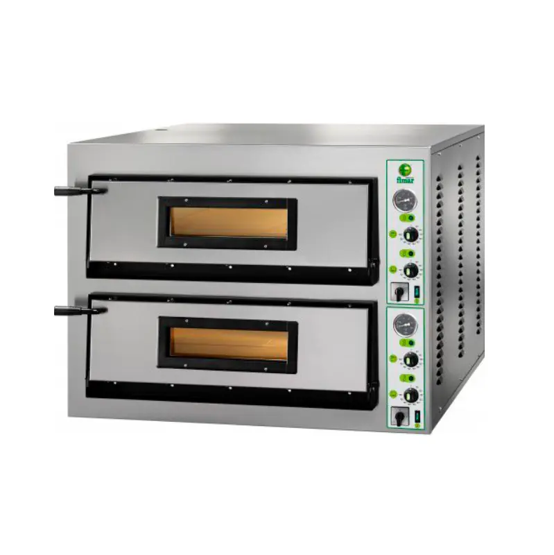 Profesionalna električna pizza peć FML6+6: prednja strana od nehrđajućeg čelika ili rustikalna obloga – toplinska izolacija premazom od kamene vune – vrata s revizijskim staklom od pireksa – pirometri – unutarnja rasvjeta – 2 termostata za svaku komoru .