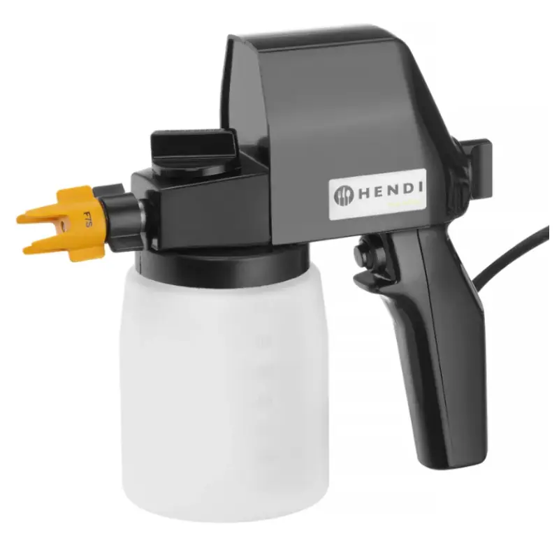 Set uključuje zamjenjive mlaznice: ravnu ventilatorsku mlaznicu, okruglu mlaznicu i zakrivljeni nastavak za precizno nanošenje. Klip prskalice izrađen je od visokokvalitetnog nehrđajućeg čelika, što jamči dugotrajnost i pouzdanost uređaja. Električna prskalica za hranu HENDI, omogućuje postizanje profesionalnih rezultata u kuhinji, bilo da pripremate slastice, marinade ili druge kulinarske kreacije.