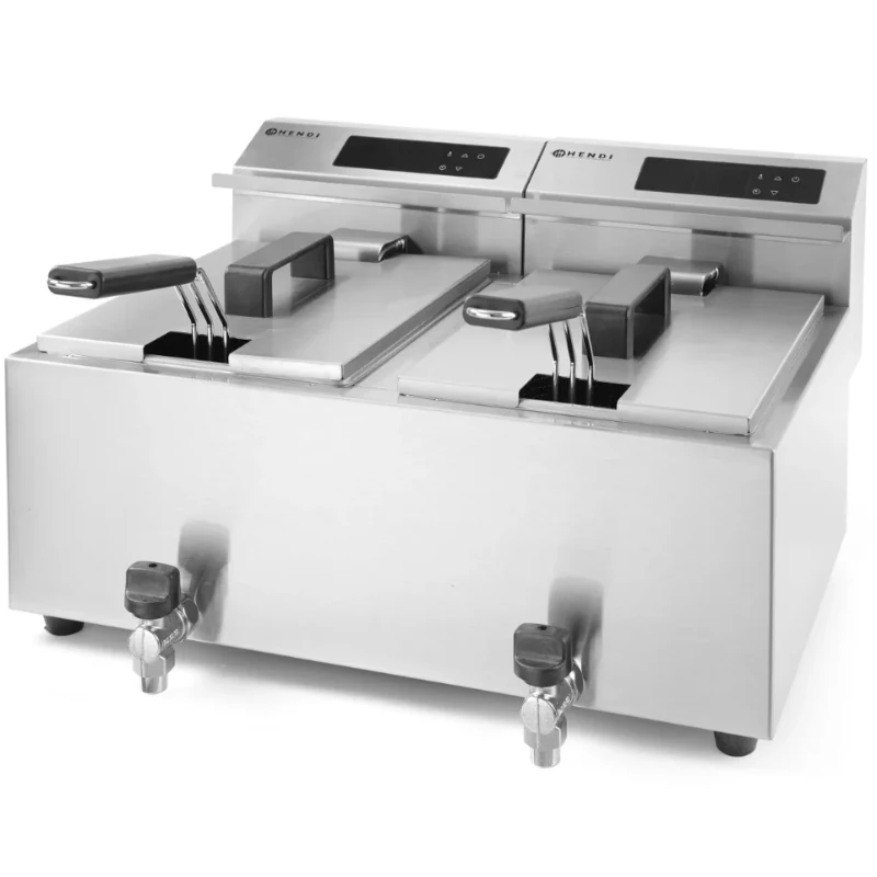 Friteza Profi Line digitalna s ispusnim ventilom savršena je za ugostiteljske objekte s velikim kapacitetima. Omogućuje istovremeno prženje većih količina hrane ili različitih namirnica. Spremnici su izrađeni od visokokvalitetnog nehrđajućeg čelika i opremljeni “hladnom zonom” koja produžuje vijek trajanja ulja, dok ispusni ventil omogućuje jednostavno pražnjenje i održavanje.