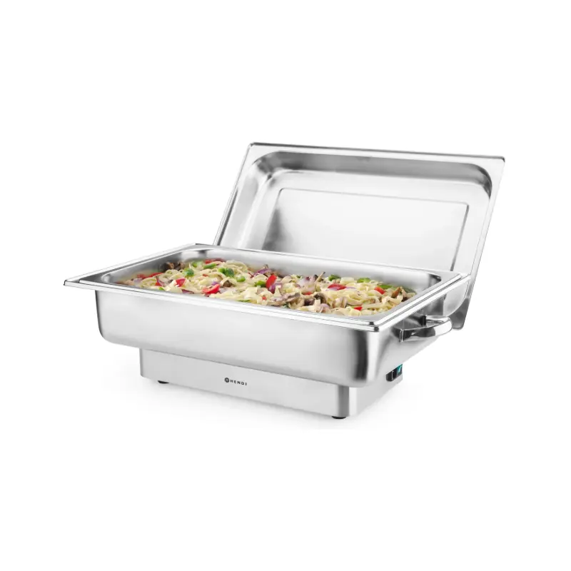 HENDI električna posuda za podgrijavanje hrane Pollina izrađena je od nehrđajućeg čelika i namijenjena profesionalnoj upotrebi u ugostiteljstvu. Ovaj uređaj omogućuje jednostavno i sigurno održavanje hrane toplom, idealno za buffete, catering servise i samoposlužne linije. Temperatura se može precizno podešavati do 85 °C, čime se zadržava svježina i tekstura jela.