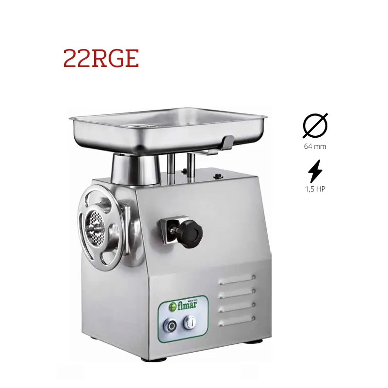 Profesionalna mesoreznica Fimar 22RGE izrađena je od nehrđajućeg čelika i namijenjena je profesionalnoj upotrebi. Mehanizam za mljevenje je uklonjiv, što omogućuje jednostavno čišćenje i higijensku pohranu u hladnjaku. Profesionalna mesoreznica Fimar 22RGE opremljena je ulazom za meso promjera 64 mm, sigurnosnim mikroprekidačima i uljnim prijenosnikom za pouzdan rad.