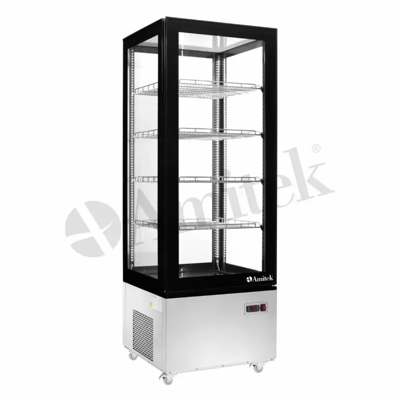 Profesionalna vitrina za kolače AK400ETQ talijanskog proizvođača Amitek.  Ova vitrina za kolace redstavlja spoj vrhunske tehnologije i izdržljivosti.  Dizajnirana je da izdrži intenzivnu upotrebu i osigura dugotrajnu pouzdanost. S kapacitetom od 400 litara, ova vitrina nudi prostran unutarnji prostor (595x595x1330 mm) s četiri prilagodljive police, idealne za izlaganje različitih vrsta slastica.