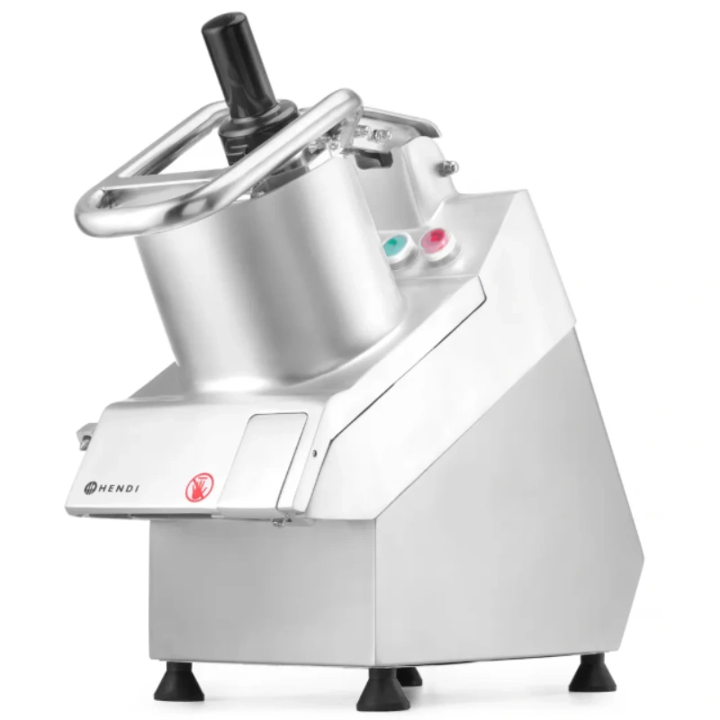 Profesionalni rezač za povrće HENDI nudi motor snage 750 W, s niskonaponskim tipkama za START i STOP. Automatska sigurnosna rješenja isključuju uređaj prilikom podizanja ručke ili gornjeg poklopca, što rad čini sigurnijim. Kada se ručka spusti, rezač se pokreće automatski. Njegova brzina od 300 okretaja u minuti omogućuje kapacitet obrade od 100 do 350 kg/h. Usto, četiri gumirane noge jamče stabilnost čak i pri intenzivnijem radu.
