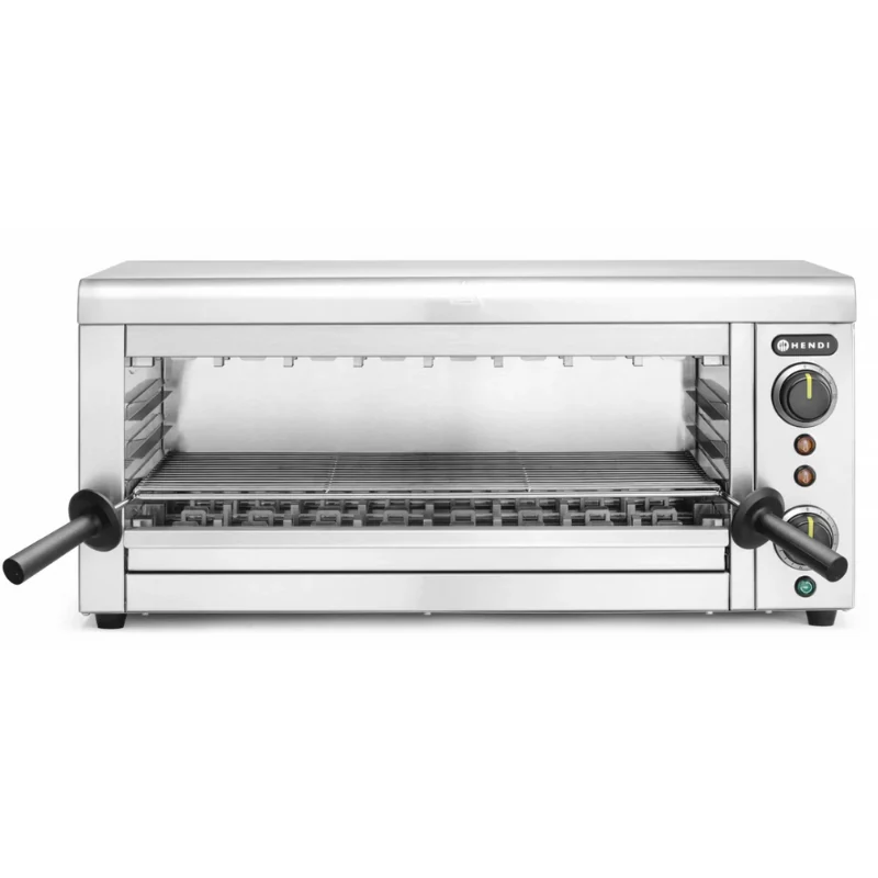Ovaj salamander omogućuje precizno podešavanje temperature i dolazi s 15-minutnim tajmerom i indikatorom rada. Rešetke su lako podesive, a uređaj je opremljen posudom za mrvice, što olakšava održavanje. Kompaktne dimenzije i jednostavan dizajn čine ga praktičnim za profesionalne kuhinje s ograničenim prostorom.