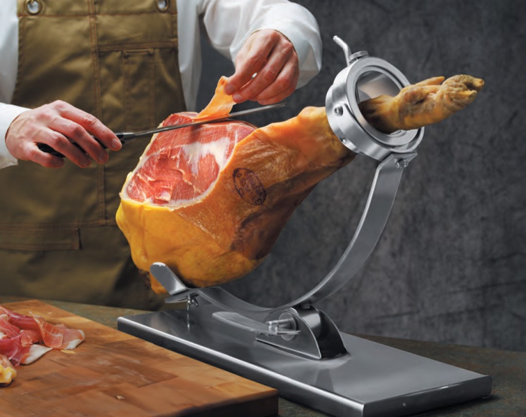 Profesionalni stalak za pršut je savršen alat za precizno i udobno rezanje pršuta. Ovaj visokokvalitetni držač omogućava sigurno i stabilno držanje pršuta tijekom procesa rezanja, čineći rezanje vrlo tankih i ravnomjernih ploški jednostavnim i preciznim. Zahvaljujući podesivom kutu držača, možete lako prilagoditi poziciju pršuta kako bi se došlo do svakog komadića mesa.